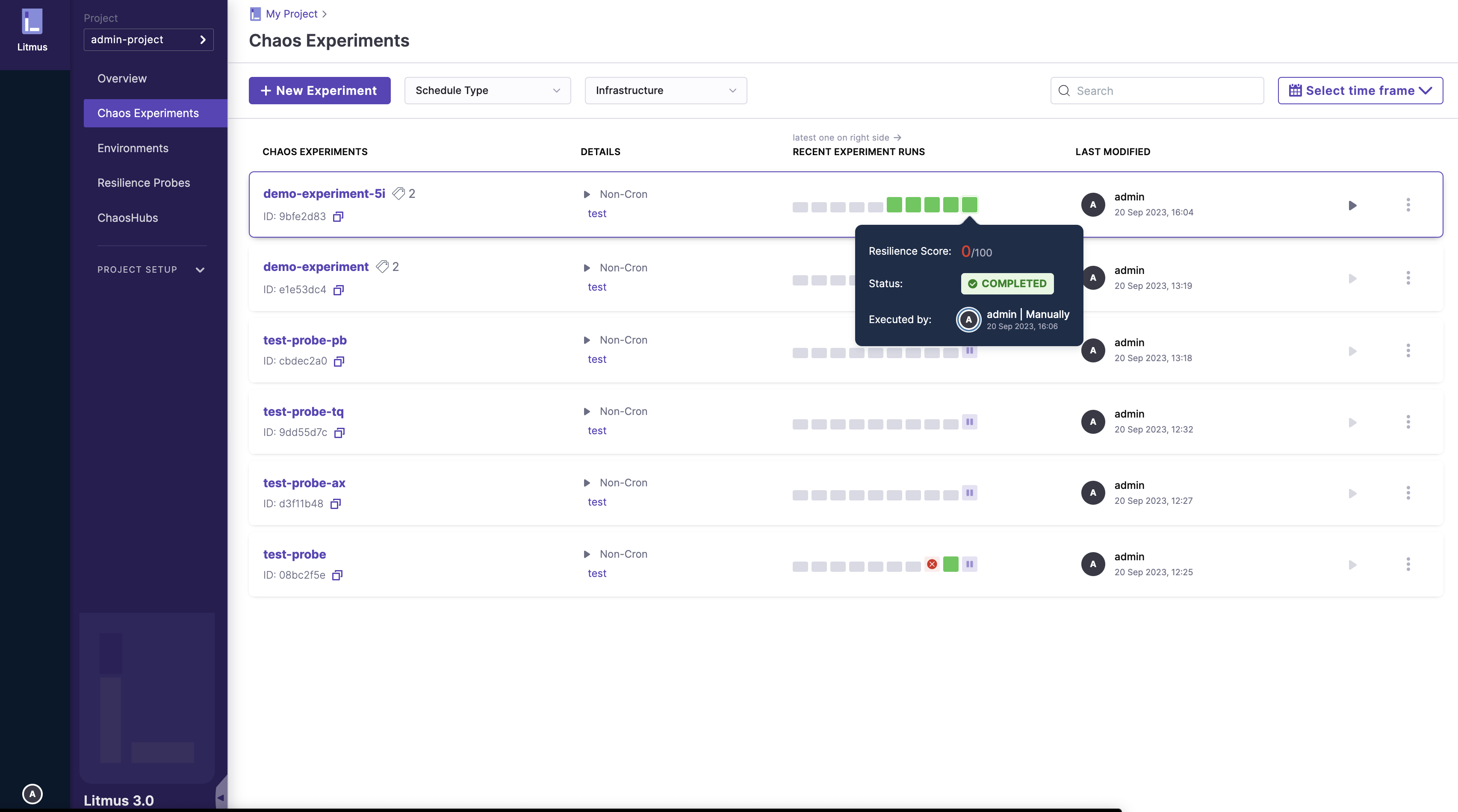 After scheduling a chaos experiment, a user can view the details of the running chaos experiment from the ChaosCenter. ChaosCenter provides a real-time graph that is used to visualize the chaos experiment and get the details of individual steps of the chaos experiment. Important details like the logs and target applications can be viewed from ChaosCenter. Once the chaos experiment execution is completed, the resiliency score is calculated and the ChaosResult for the ChaosEngine pods is available.