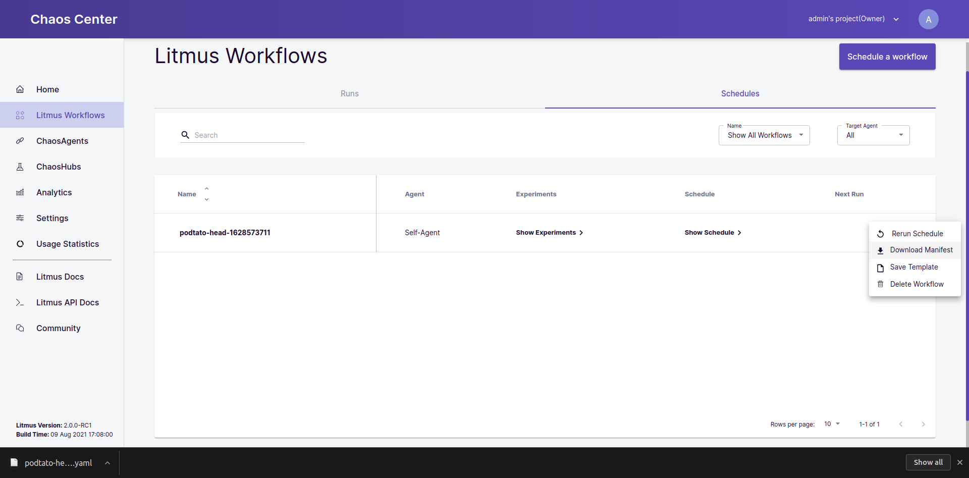After opening the options menu, click on the Download Manifest option. Having downloaded a particular schedule manifest, you can see the browser downloads list to see the status of the manifest download operation and then see the yaml file in your system's default download directory: