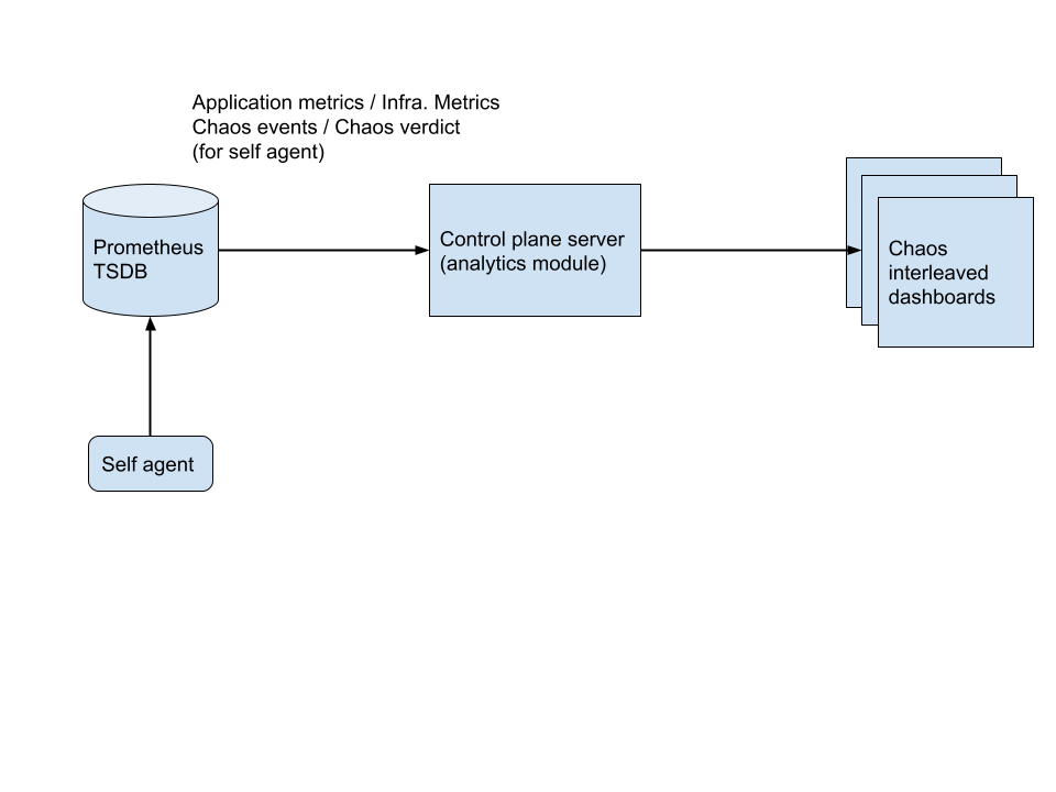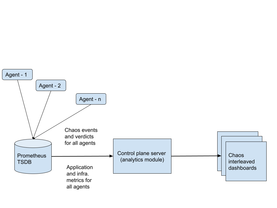 • Separate dashboards can be created by selecting specific chaos delegate s and the data source which is essentially a Prometheus time series database, collecting metrics from the chaos delegate cluster for application / infra metrics, chaos events and chaos verdicts.